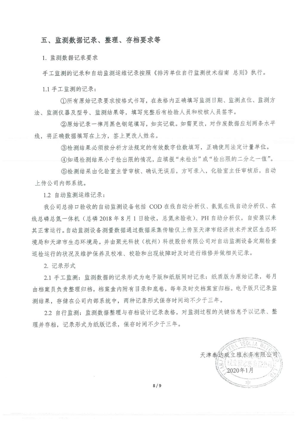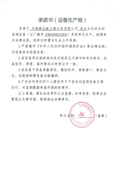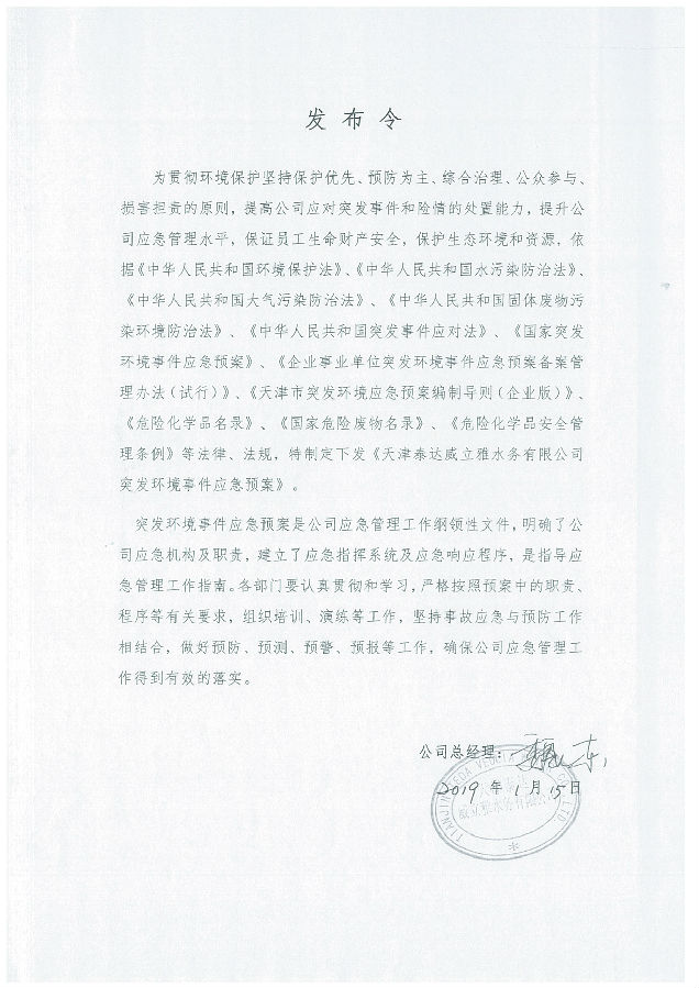 ? 公司出水指標數據經現場數據采集儀采集后直接上傳至天津開發區環保局及天津市環境監測中心。天津市環境監測中心直接將接收自公司的上傳數據發送至國家環保部。實現了對我公司出水指標數據的實時在線監控和監督管理。 自2014年,依《國家重點監控企業污染源監督性監測及信息公開辦法(試行)》,主要污染物排放情況經天津市重點企業自行檢測數據發布系統對外公布,主動接受社會公眾監督。 信息發布平臺 2025年第2季度環境信息公開:天津泰達威立雅水務有限公司 公司名稱:天津泰達威立雅水務有限公司 統一社會信用代碼:91120116663055985N 法定代表人:徐寶平 生產地址:天津經濟技術開發區南海路188號 聯系電話:022-62018666 處理規模:10萬m3/日市政污水 生產經營和管理服務的主要內容: 水處理系統工程集成;城市污水處理、工業廢水處理、海水及苦咸水淡化處理;再生水、工業純水、水處理設備銷售;水處理設施運營、管理及相關的設計、咨詢、技術服務。 其他信息: 天津泰達威立雅水務有限公司成立于2007年7月。天津泰達投資控股有限公司與法國通用-威立雅水務集團各持股51%與49%。由天津經濟技術開發區管理委員會公用事業局授權,天津泰達威立雅水務有限公司負責開發區第一污水處理廠及其附屬設施、海晶東雨污水泵站、開發區電鍍廢水處理中心的運營、維護保養及經營。 項目(出水) 平均值(mg/L) A標準(DB12/599-2015) (mg/L) 化驗次數(次) 合格率(%) 我公司排放口數量為一個,位于廠區東南側。處理后出水排入市政專用排污管道,經北排泵站排入渤海灣。2025年4-6月我公司COD、氨氮、總氮、總磷排放總量如下: 168.92 天津泰達威立雅水務有限公司為原天津經濟技術開發區污水處理廠,是天津濱海新區第一座污水處理廠,位于開發區南海路與第十二大街交口處,污水處理項目投資總額3.5534億元人民幣,占地8.1公頃,設計能力為日處理污水10萬m3,其中市政污水的比例高于60%。污水處理工藝目前采用“預處理+SBR+反硝化濾池+臭氧催化高級氧化+紫外消毒”。脫水機房、進水泵房、預處理單元和儲泥池的臭氣經過收集管道收集進入生物過濾塔除臭處理。剩余污泥經脫水機脫水處理,泥餅外運處理。工藝系統由在線儀器儀表輸送到中控室實現自動控制。 出水水質達到天津市《城鎮污水處理廠污染物排放標準》(DB12/599-2015)A排放標準。廠界噪聲均滿足《工業企業廠界噪聲標準》GB12348-2008(3類)晝、夜標準值。廠界無組織排放廢氣中臭氣濃度、氨、硫化氫濃度均符合《惡臭污染物排放標準》(GB12/059-2018)限值要求。 開發區第一污水處理廠現狀主要的大氣影響來自預處理單元(格柵與沉砂池)和污泥區(污泥脫水機房)的惡臭氣體。污泥脫水機房、污泥料倉、三合一泵房等設施產生的臭氣集中收集,儲泥池、預處理單元等采用加罩密閉設計,臭氣集中收集至生物除臭裝置,除臭效率不低于80%,處理后由15米高排氣筒達標排放。根據天津市環保局《關于天津開發區第一污水處理廠改造工程環境影響報告書的批復》,開發區第一污水處理廠的衛生防護距離設為100m。 污水廠廢氣監測結果表明,廠區周界監測點位臭氣濃度均低于20(無量綱),符合《惡臭污染物排放標準(GB12/059-2018)的標準要求。 開發區第一污水處理廠污水經處理后達到天津市《城鎮污水處理廠污染物排放標準》(DB12/599-2015)A排放標準要求。污水處理廠工藝過程本身沒有生產性廢水排放,所排污水主要為生活污水和污泥處理水,這部分廢水一同返回本污水處理廠的進水泵房,與市政污水一并處理。2025年4-6月出水達標率為100%,無超標情況。 開發區第一污水處理廠主要的噪聲設備為鼓風機,鼓風機位于鼓風機房,并設置隔音減震措施,其噪聲影響甚微。 監測結果:廠界噪聲共設置4個噪聲監測點,執行《工業企業廠界環境噪聲排放標準》(GB12348-2008)3類標準,根據監測結果,各廠界處噪聲均符合執行標準要求。 污水廠運行過程中產生的固體廢棄物主要為柵渣、沉砂、污泥及生活垃圾。生活垃圾和柵渣交由開發區環衛綜合服務公司清運處理;產生的脫水污泥委托天津恒基環境工程有限公司和天津萬德生物工程有限公司進行資源化、無害化、減量化處理。 編 號 名 稱 發 布 單 位 批號 時 間 1 《關于天津經濟技術開發區10萬噸/日污水處理廠項目環境影響報告書的批復》 天津市環境保護局 津環保管 (1998)第43號 1998.2.18 2 《關于天津開發區污水處理廠改造工程環境影響報告表的批復》 天津經濟技術開發區 環境保護局 津開環評 【2008】198號 2008.12.8 3 《天津經濟技術開發區環境保護局關于天津經濟技術開發區第一污水處理廠提標改造工程環境影響報告書的批復》 天津經濟技術開發區 環境保護局 津開環評書 【2017】18號 2017.8.30 我公司根據《中華人民共和國環境保護法》以及《天津市突發事件總體應急預案》等相關文件要求,于2019年1月編制(修訂)完成了《天津泰達威立雅水務有限公司突發環境事件應急預案》,于 2022年7月19日完成變更備案并發布(備案編號:120116-KF-2022-117-L)。 天津泰達威立雅水務有限公司 2025年7月8日