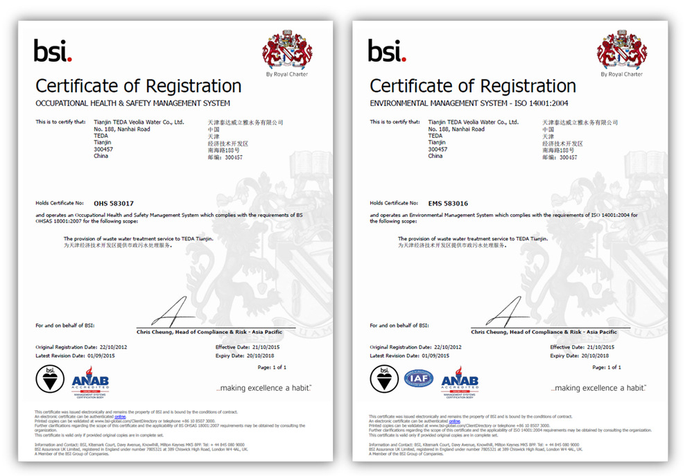 2012年公司獲得BSI公司頒發(fā)的ISO 14001和OHSAS 18001體系認證證書,保持著ISO 14001與OHSAS 18001體系的穩(wěn)定運行。